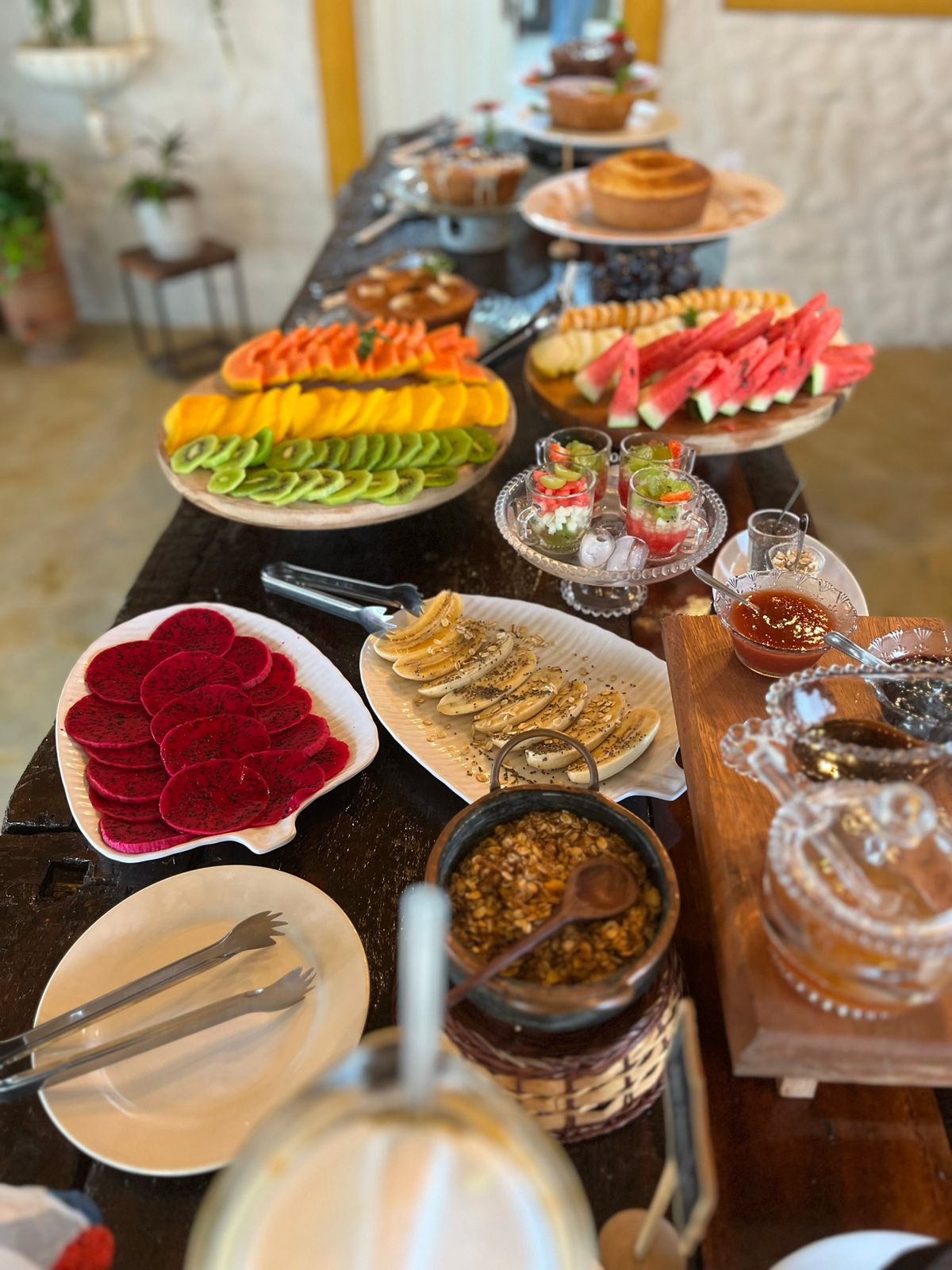 Mesa farta com pães, bolos, frutas frescas, queijos e café coado na hora e mais.